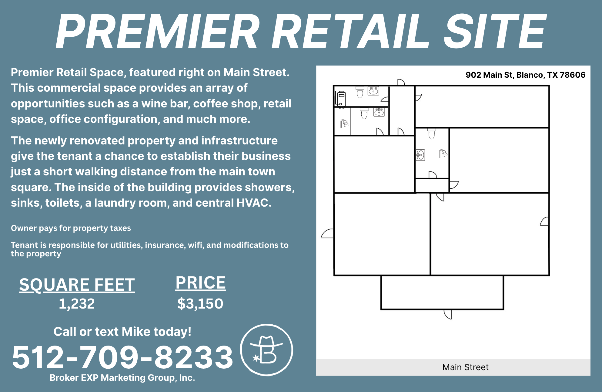 Position your business in the heart of Blanco with this highly visible, end-cap retail space just steps from the historic town square. This newly renovated commercial unit offers flexibility for a variety of uses—ideal for a wine bar, coffee shop, boutique retail, or professional office.